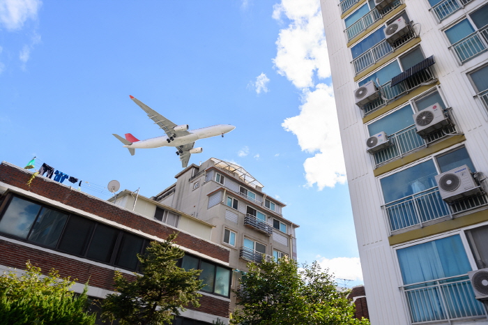 소음대책지역인 신월동에서 낮게 비행 중인 항공기 모습. 양천구청 제공