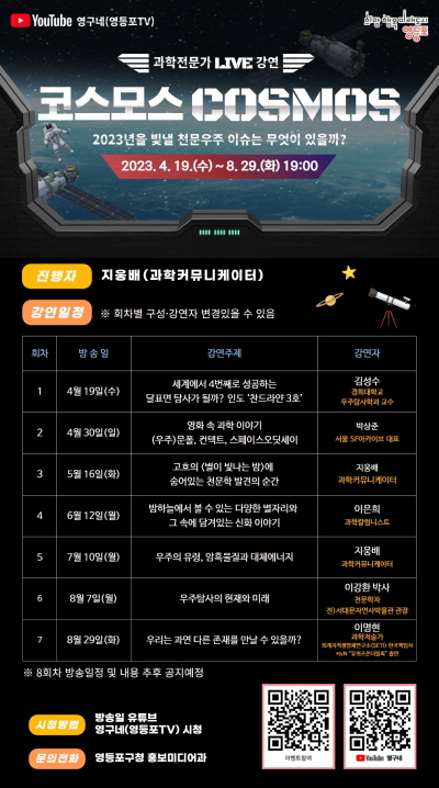 영등포구가 과학소통 강연 ‘코스모스(COSMOS)’를 진행한다. 구 관계자는 “최근 누리호와 다누리호 발사로 커진 우주분야 관심에 부응하고, 미래 과학 인재를 양성하기 위해 이 강연을 계획했다”고 밝혔다. 강연은 과학 커뮤니케이터이자 유튜브에서 과학 채널을 운영하는 지웅배가 진행자로 나서고 각 분야의 유명 교수와 작가, 전문가가 ‘2023년 빛낼 천문‧우주 이슈는 무엇이 있을까’라는 주제로 강연을 펼친다.