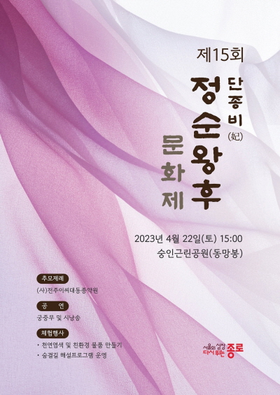 종로구가 ‘단종비 정순왕후 문화제’를 숭인근린공원(숭인동) 동망봉에서 22일 연다. (사)전주이씨대동종약원이 주관하는 이번 행사는 추모 제례, 정순왕후 삶을 그리는 궁중무·시낭송 공연 등으로 구성했다. 아울러 오후 1시부터 3시까지 본 행사에 앞서 염색체험, 친환경 샴푸바 만들기 등 주민 참여 프로그램도 준비했다. 또 창신역에서 시작해 자주동샘(비우당), 청룡사(정업원 터), 동망봉, 정순왕후 기념관 등을 골목길 해설사와 함께 돌아보는 ‘정순왕후 숨결길’ 탐방 프로그램도 진행된다.