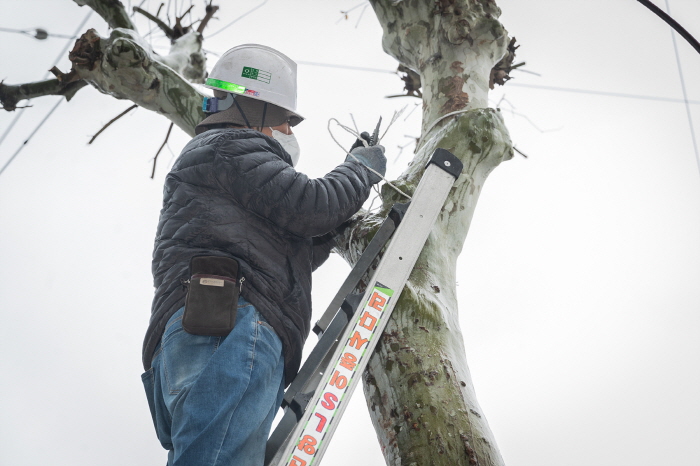 가로수에 남은 불법현수막 끈을 제거중인 모습. 양천구청 제공