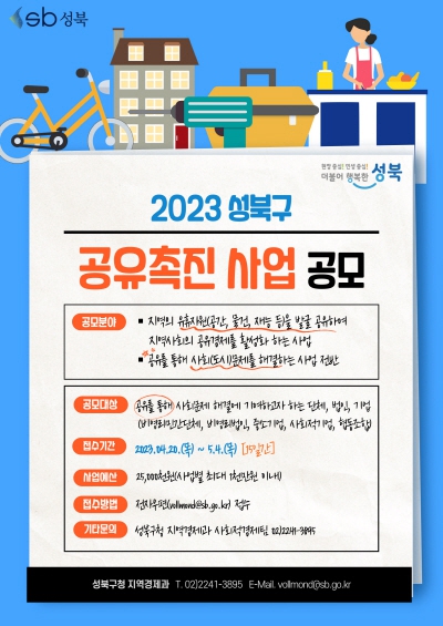 이승로 성북구청장은 “공유 촉진 공모사업을 통해 공유경제가 활성화 되어 지역공동체를 복원하고 도시문제를 해결하는 공유문화가 지역 곳곳에 전파·확산하기를 바란다”고 전했다.