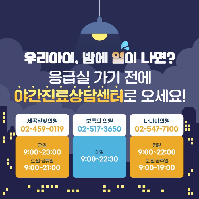 강남구가 야간·휴일에 소아 진료를 하는 1차 의료기관 3곳을 야간진료상담센터로 지정하고 지난 1일 협약을 맺었다. 의료기관은 △세곡달빛의원(세곡동) △다나아의원(논현동) △보통의의원(압구정동)이다. 운영시간은 △세곡달빛의원(세곡동) 평일 아침 9시부터 밤 11시, 휴일은 밤 9시 △다나아의원(논현동) 매일 아침 9시부터 밤 10시, 휴일 아침 9부터 저녁 7시 △보통의의원(압구정동) 매일 아침 9시부터 밤 10시30분까지다.
