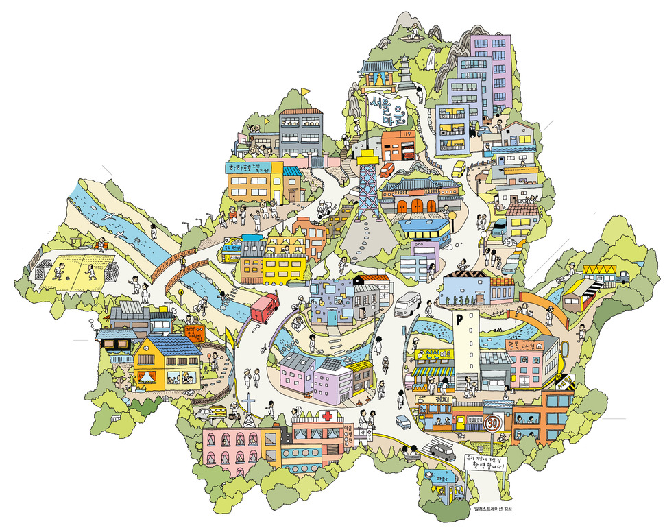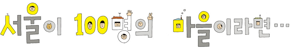 세월을 거슬러 올라가면 백제 시대 수도에 이르기까지 예나 지금이나 서울은 우리나라를 대표하는 중심 도시로 함께해왔습니다. 서울 한복판에는 한강이 유유히 흐르고 아름다운 산들이 서울을 따뜻하게 감싸 안고 있지요. 서울에는 현재 대략 1천만명이 넘는 사람이 더불어 살아가고 있어요. 사실 1천만(10,000,000)이라는 숫자가 커서 잘 와 닿지 않아요. 이제부터 서울을 딱 100명이 사는 마을로 상상해볼까요. 이 상상의 마을에서 1명의 사람은 약 10만(100,000)명을 말하는 거예요. 자, 이제 우리 마을에 100명의 사람이 모여 살고 있습니다. 마을 사람들은 어디서 어떻게 무엇을 하며 살고 있을까요? 지금부터 우리 마을의 요모조모를 알아보아요. 우리 마을의 어제와 오늘은?