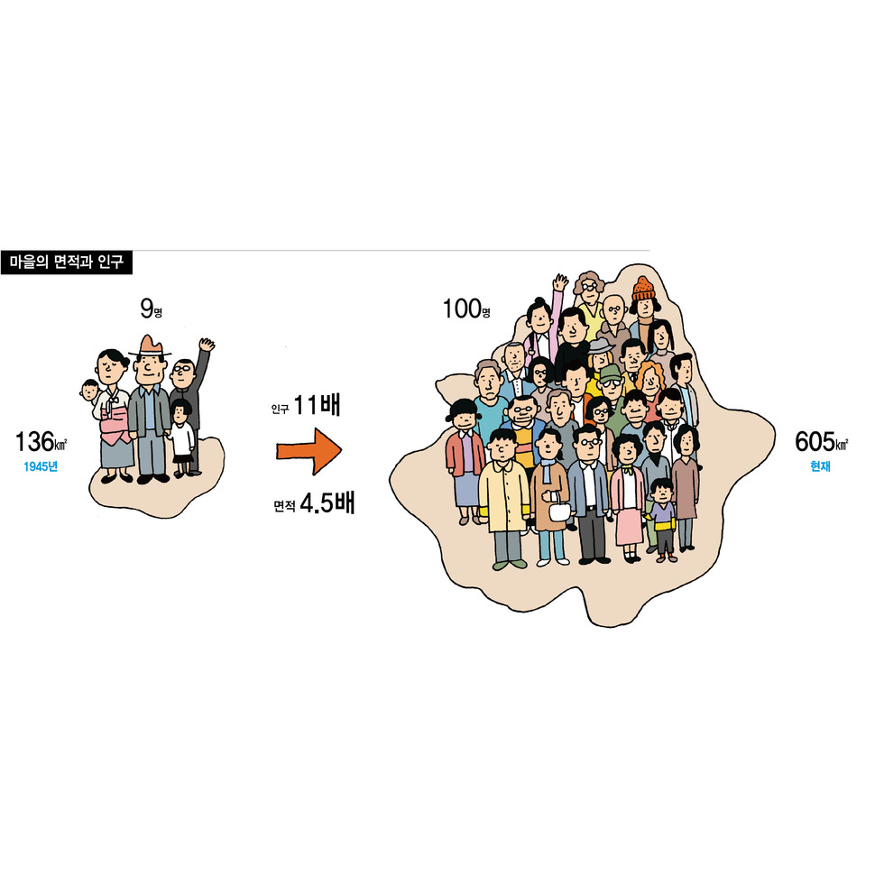 우리 마을의 면적은 1945년보다 현재 약 4.5배 정도 늘어났어요.(136㎢에서 605㎢로)