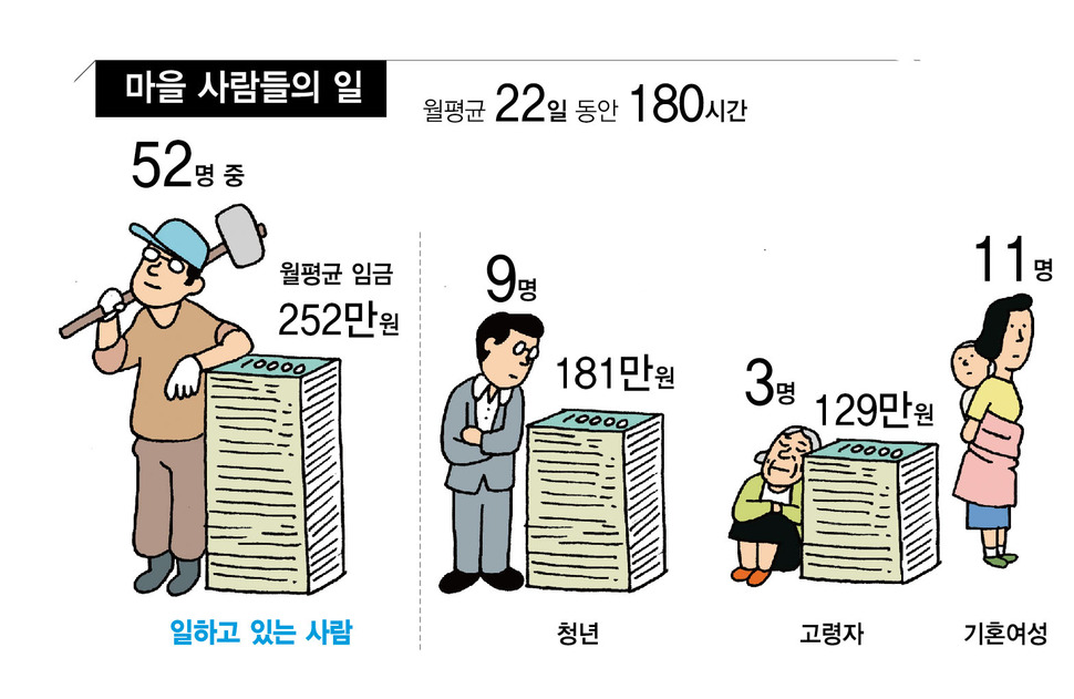 마을 사람들은 평균 월 22일 동안 180시간을 일하고 있어요.