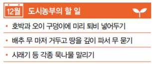 더 나은 내년 농사를 위해 텃밭지도를 꼼꼼히 살펴야 한다. 돌려짓기의 설계도가 텃밭지도다. 지난 한 해 쓴 농사일기도 다시 살펴보며 부족하거나 잘못한 것들을 찾아내자. 도시농부 학교 등 텃밭 교육단체에서 교육받는 것도 좋겠다. 농사는 내 안에 잠들어 있는 생명의 소중함을 일깨우는 일이다. 자연의 이치와 농사의 철학이 담긴 절기를 다시 한 번 꼼꼼히 공부하는 것도 도움이 되겠다.