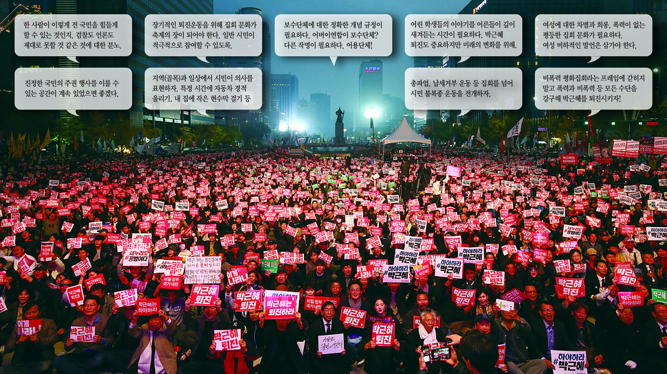 “정권을 퇴진시키자는 집회에서 힙합이 뭐냐. 좀 엄숙했으면 좋겠다.” 행정학을 공부하는 대학생이라고 자신을 밝힌 청년의 의견에 “집회에 메시지가 너무 많다. 좀 단일한 목소리를 냈으면 좋겠다”며 한 시민이 의견을 보탰다. 조용히 경청하던 다른 청년이 “그럼 1987년처럼 돌멩이 들고 싸우고 다치고 죽자는 이야기냐”는 반대 의견을 내자, “단일함은 전체주의에서 비롯된 거 아니냐. 시민은 다양한 방식으로 자신의 의사를 표현할 자유가 있다”는 지지 발언이 이어졌다. 반론 기회를 얻은 대학생은 “다른 분 말씀을 들어보니 내가 편협했던 거 같다”며 자신의 의견을 바꾸자 잔잔한 박수가 터져나왔다. 60만 명의 시민이 박근혜 하야를 외친 지난 19일 서울시청 시민청 활짝라운지에서 열린 와글와글 시민평의회(시민평의회)의 한 모습이다.