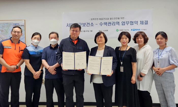 박선정 서대문구보건소장(오른쪽 네 번째)과 조기한 한국철도공사 수색관리역장(왼쪽 네 번째)이 ‘지역주민 마음 건강과 철도 안전을 위한 업무협약’을 맺고 있다. 서대문구청 제공