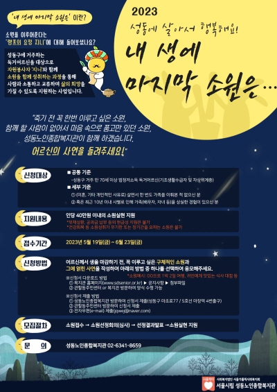 성동노인종합복지관(마장동)이 어르신들의 소원을 들어준다. 신청대상은 성동구에 거주하는 만 70세 이상 기초생활수급자와 차상위계층 중 미혼이거나 최근 10년 이내 사별로 가족을 잃은 어르신이다. 23일까지 생을 마감하기 전 꼭 이루고 싶은 소원과 그에 얽힌 사연을 신청서에 담아 동 주민센터 또는 성동노인종합복지관에 접수하면 된다. 현금성 지원이나 소원성취에 상당한 기간이 걸리는 소원 등 실현 불가능 사연은 제외된다.