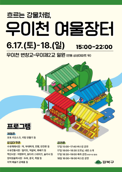 강북구가 17~18일 우이천 번창교 일대에서 ‘우이천 여울장터’를 연다. 축제가 개최되는 곳은 우이천 번창교에서 우이제2교 일대 약 150m 구간이다. 이곳에서 이틀간 오후 3시부터 밤 10시까지 수유재래시장, 수유전통시장, 장미원골목시장, 백년시장 4곳이 참여한 팝업스토어가 열린다. 팝업스토어에선 부대찌개‧밀키트‧떡갈비‧머랭쿠키‧콩국‧족발 등 전통시장 대표 먹거리를 판매하며, 시민들은 테이블‧빈백‧폴딩의자 등으로 꾸며진 휴게존에서 구매한 음식을 먹을 수 있다. 같은 시간 팝업스토어 옆엔공예‧크래프트 작가 15팀의 작품들을 전시하고 판매하는 플리마켓과, 키링‧구슬팔찌‧가방만들기, 타투체험, 원예테라피 등 다채로운 체험부스를 운영한다. 서울시 거리공연단 6팀의 생생한 버스킹공연도 준비되어 있다.