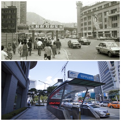 (위)1978년 당시 회현 지하상가 입구 전경. 주변에 서울역 고가와 신세계백화점이 보인다. (아래)2016년 현재 회현 지하상가 입구 전경. 지금은 회현 지하쇼핑센터로 이름이 바뀌었다.