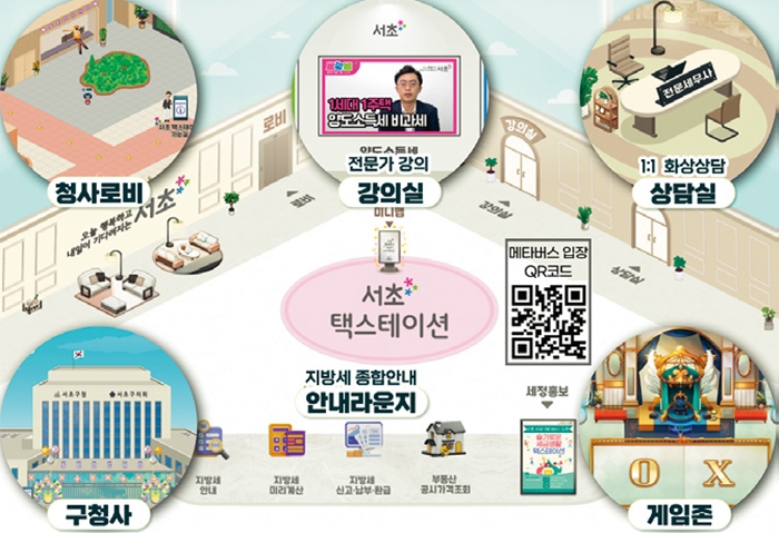서초구(구청장 전성수)는 세무 전문 메타버스를 오픈해 온·오프라인을 아우르는 세금 정보 종합제공 서비스를 21일부터 본격 운영한다. 구는 기존 오프라인 세무행정서비스와 메타버스 ‘서초 택스테이션(Tax Station)’을 더해 세금 정보에 접근성을 높이고 소통창구 다변화로 이용자 편의성을 증진한다. 서초 택스테이션은 구가 세금을 전문관리 해주는 가상공간을 의미한다. 이 서비스는 메타버스 플랫폼 젭(ZEP)을 통해 가상공간 세무서비스를 구현하고 △세무상담실 △세금강의실 △월별 지방세 일정과 환급금 신청을 포함한 지방세 종합안내 등 메뉴를 제공한다. 메타버스는 URL 주소(zep.us/play/yaB7A5)를 클릭 또는 정보무늬스캔만으로 간편하게 입장할 수 있다.