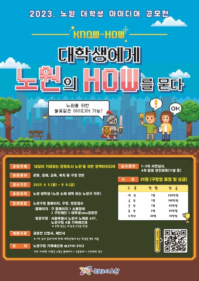 노원구가 대학생들의 참신한 아이디어를 구정에 반영하기 위해 ‘2023 대학생 아이디어 공모전’을 개최한다. 올해 공모전 주제는 ‘내일이 기대되는 문화도시 노원’이다. 문화, 경제, 교육, 복지, 보건, 환경, 교통 등 구정 전반에 걸쳐 구민들의 생활과 편의를 증진할 수 있는 구체적이고 실행 가능한 아이디어를 찾는다.