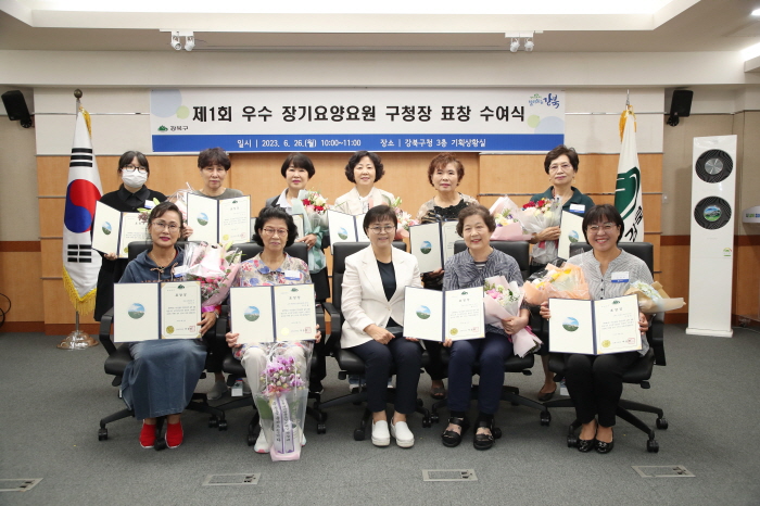 강북구가 26일 구청 기획상황실에서 우수 장기요양요원 표창식을 열었다. 이날 표창자 10명은 강북구 장기요양요원 3900여명 중 노인복지 증진에 공이 큰 사람들로 기관의 추천을 받고 공적심사위원회를 거쳐 선정됐다.