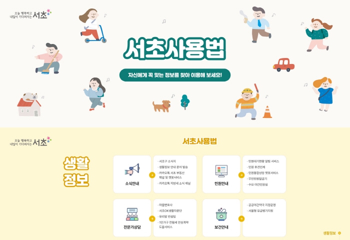 구는 지난 3월 다양한 생활정보와 정책을 한 곳에 통합해 편리하게 확인하고 싶다는 주민 건의사항을 반영해 ‘서초사용법’을 책자 형태로 제작해 배부한 바 있다. 이번에 새롭게 운영하는 ‘내 손 안의 서초사용법’ 서비스는 기존에 제작한 책자를 바탕으로 모바일 환경에 적합한 웹페이지 형태로 제작했다.