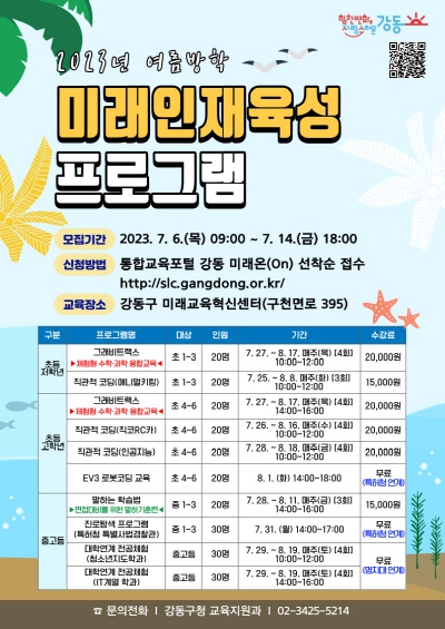 여름방학 프로그램 수강신청은 6일부터 14일까지 통합교육포털 강동 미래온 누리집에서 회원가입 후 신청 가능하며, 자세한 내용은 강동구청 교육지원과로 문의하면 된다.