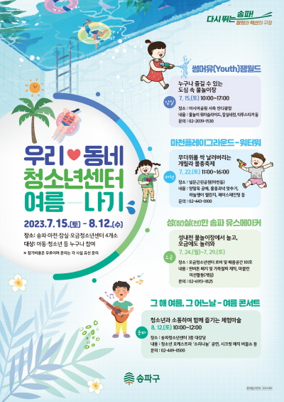 송파구가 관내 청소년센터 4곳(송파, 마천, 잠실, 오금)에서 15일부터 다음달 12일까지 여름방학 특별프로그램을 운영한다. 잠실청소년센터에서는 15일 △‘썸머유(Youth)잼월드’를 아시아공원 잔디마당에서 연다. 워터슬라이드가 설치된 물놀이장과 함께 잠실네컷 사진찍기, 타투스티커 등 다양한 체험 부스가 운영된다.