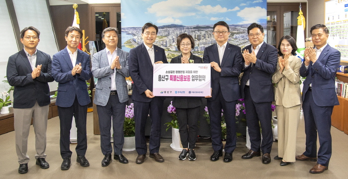 용산구가 지난 7일 담보력이 부족한 중소기업과 소상공인 자금난 해소를 위해 우리은행, 서울신용보증재단과 특별신용보증 업무협약을 체결했다. 협약에 따라 구는 보증대상을 발굴·추천하는 행정업무를 담당하고 특별보증 재원 5억원을 출연한다. 우리은행도 10억원을 출연해 187억5천만원 한도 안에서 서울신용보증재단이 대출 보증을 지원한다.
