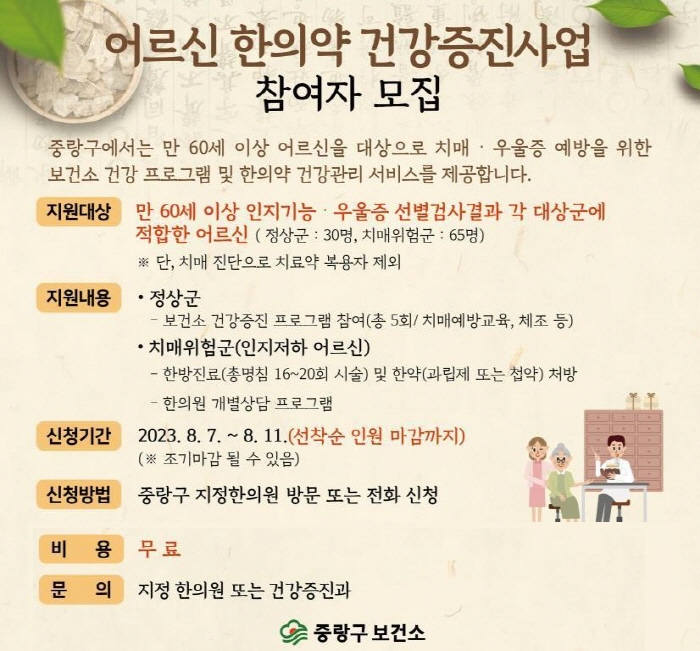 중랑구가 만 60세 이상 어르신의 치매와 우울증 예방관리에 나선다. 참여를 원하는 구민은 7일부터 11일까지 중랑구 지정 한의원에 방문 또는 전화로 신청한 후, 인지기능 및 우울증 선별 검사를 진행한다. 검사 결과에 따라 정상군 30명 및 치매위험군 65명으로 선정된 대상자는 전액 무료로 맞춤 프로그램을 제공받을 수 있다.