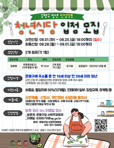 은평구가 ‘청년식당’에 입점할 청년을 모집한다. 청년식당은 요식업 창업을 희망하는 청년을 돕기 위해 은평구가 마련한 창업 점포로 은평로 9길 13(응암동)에 있다. 이 공간은 개별 주방과 홀, 창고 등 공용공간을 갖추고 있다. 입점한 청년에게는 보증금 전액, 12개월간 임차료의 50%, 인테리어 공사비 일부를 지원받는 등의 혜택이 주어진다.