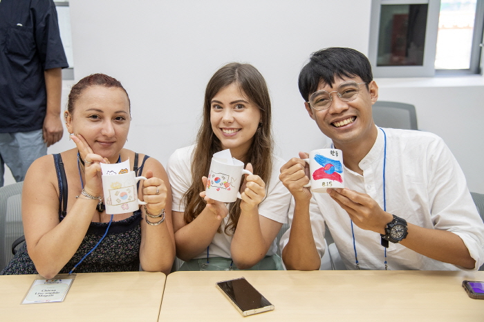 지난 8일 외국인들이 용산역사박물관 2층 교육실에서 태극기를 그린 머그잔을 들고 웃고 있다. 용산구청 제공