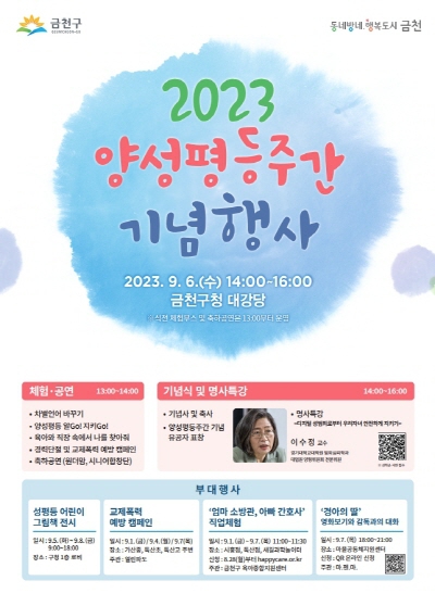 금천구가 다음달 6일 오후 2시 금천구청 대강당에서 양성평등주간 기념행사를 개최한다. 양성평등주간은 매년 9월1일부터 7일까지다. 이날 오후 1시부터 2시까지는 사전 행사를 진행한다. 7개의 시민단체가 △차별 언어 바꾸기 △양성평등 퀴즈 △교제 폭력 예방 △성격 탐색 등을 주제로 한 체험 부스를 운영한다. ‘원더맘’과 ‘시니어합창단’의 축하공연도 개최한다.