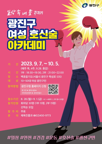 신청대상은 광진구에 거주하는 10세~50세 여성이며, 광진구청 누리집을 통해 신청하면 된다. 궁금한 내용은 광진구 체육진흥과(02-450-9773)로 문의하면 된다.