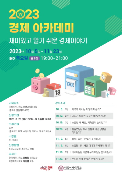 종로구가 덕성여자대학교 평생교육원과 손잡고 오는 10월부터 평생교육 프로그램 ‘2023년 경제아카데미’를 선보인다.