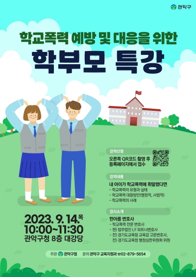 관악구가 다음달 14일 ‘학교폭력 예방 및 대응을 위한 학부모 특강’을 개최한다. 특강은 학교폭력 관련 전문인 한아름 변호사를 초청해 ‘내 아이가 학교폭력에 휘말렸다면’을 주제로 △학교폭력의 유형과 실태 △행정적, 사법적 대응방안과 사례에 대해 강의한다. 관내 학부모 또는 특강에 관심있는 누구나 참여할 수 있으며, 신청은 28일부터 다음달 12일까지 구글 QR코드에 접속해 신청할 수 있다.