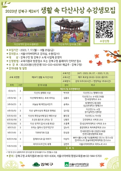 강북구가 평생학습프로그램 ‘생활 속 다산 사상’에 참여할 24기 수강생을 모집한다. 교육일정은 다음 7일부터 매주 목요일 서울사이버 대학교에서 진행하는 강의 10회와 정약용 선생의 삶을 직접 느껴볼 수 있는 현장답사 1회를 포함한 총 11주 과정으로 구성됐다. 이 과정은 대학의 우수한 교수진과 서울사이버대학교 평생교육원이 함께 운영하는 강북구만의 특색있는 교육과정이다.