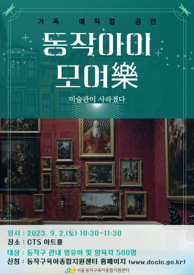 동작구가 영유아 시기 예술적 감성을 키울 수 있도록 가족과 관람할 수 있는 매직컬 공연 ‘미술관이 사라졌다’를 다음달 2일 무료로 선보인다. 매직컬은 마술과 뮤지컬을 결합한 공연으로, 이날 공연은 오전 10시 30분 ~ 11시 30분 CTS 아트홀(노량진로 100)에서 동작구에 거주하는 영유아 가정 약 500명을 대상으로 진행된다.