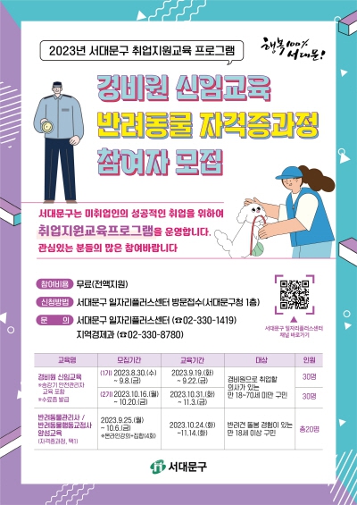 서대문구가 경비원으로 취업하기 원하는 주민들을 위해 무료 교육과정을 마련했다. 경비원으로 근무하기 위해서는 경비업법에 따라 경찰청장이 지정 고시하는 교육기관에서 법정 교육을 이수해야 한다.
