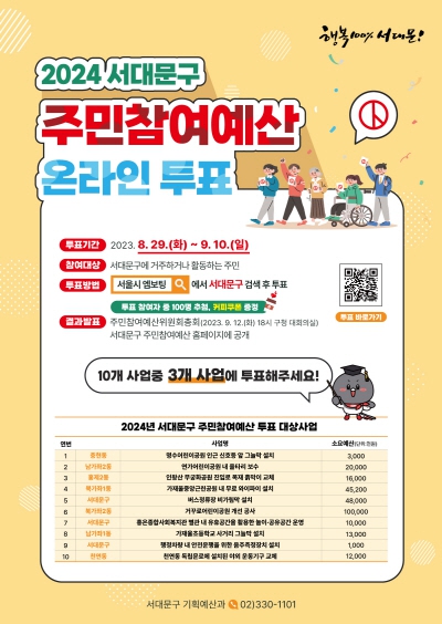 서대문구가 10일까지 2024년 주민참여예산사업 선정을 위한 온라인 주민투표를 진행한다. 대상은 올해 6월까지 접수된 주민 제안 가운데 구청 관련 부서의 검토와 서대문구 주민참여예산위원회의 1차 및 2차 심사를 거쳐 선정된 10개 사업이다.