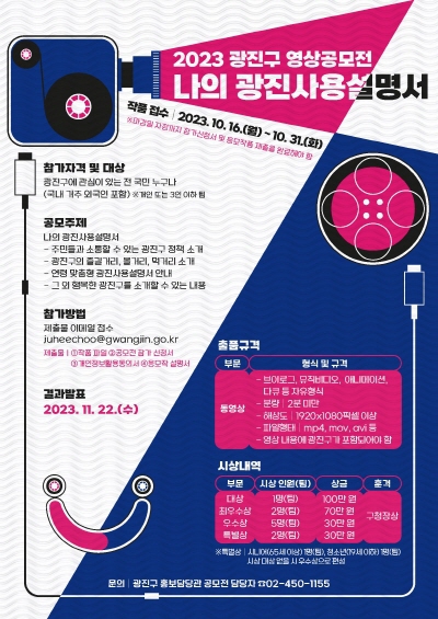 광진구가 다양한 정책·명소 등을 전 국민에게 소개하는 ‘2023 영상 공모전’을 개최한다. 공모 주제는 ‘나의 광진 사용 설명서’로 △광진구의 정책 △즐길거리, 볼거리, 먹거리 △연령 맞춤형 광진사용설명서 △그 외 행복한 광진구의 모습 등 다양한 소재를 2분 미만 영상에 담아내면 된다.