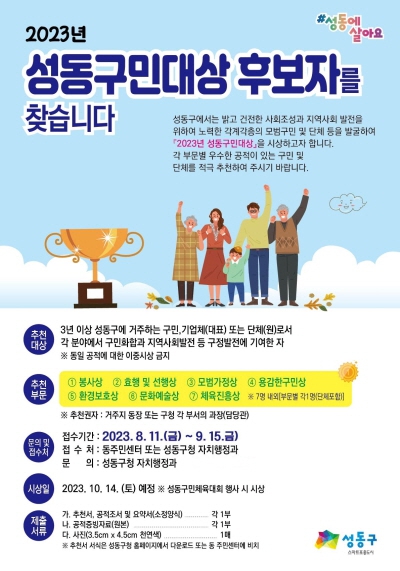 성동구가 15일까지 제26회 성동구민대상 수상자가 될 주인공을 찾는다. 성동구민대상은 밝고 건전한 사회를 조성하고 지역사회 발전을 위하여 이웃 사랑을 실천하고 있는 모범구민 및 단체를 발굴하여 그 뜻을 기리고자 추진하고 있다.