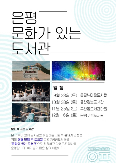 은평구가 연말까지 넷째 주 토요일마다 관내 공공도서관을 ‘문화가 있는 도서관’으로 지정해 다양한 문화예술 행사를 연다. 관내 모든 공공도서관 8곳이 참여하며, 매월 대표도서관 1곳을 지정해 규모 있는 문화예술 행사를 열고, 나머지 7개 도서관에서도 소규모 행사를 연다.