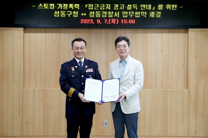 성동구가 지난 7일 성동경찰서와 협약을 맺고 스토킹, 가정폭력 등 범죄 피해자를 보호하기 위해 ‘가해자 접근금지 경고‧설득 안내’ 사업을 추진한다. 구는 이번 협약으로 범죄 가해자가 피해자에게 전화 등을 이용할 때 자동으로 경고와 설득을 담은 음성메시지를 보내 접근금지를 유도해 2차 가해 등 범죄를 예방한다.