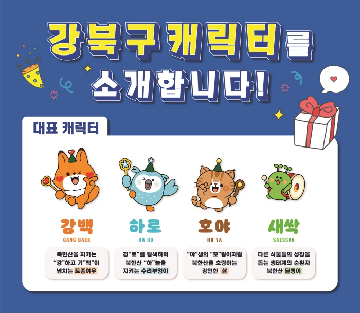 강북구를 상징하는 대표캐릭터 4종이 탄생했다. 구는 여우 ‘강백’, 부엉이 ‘하로’, 삵 ‘호야’, 달팽이 ‘새싹’이를 대표캐릭터로 확정했다. 캐릭터는 구민을 대상으로 지난 6~7월 후보 작품 온·오프라인 투표를 해 지난달 최종 선정됐다. 여우 ‘강백’, 부엉이 ‘하로’, 삵 ‘호야’, 달팽이 ‘새싹’이는 모두 북한산 멸종위기종이다. 산신령의 도움을 받아 신비한 능력과 생명력을 얻어 인간과 공존하게 됐고, 사람들에게 자연의 소중함을 일깨워주면서 행복한 삶을 살도록 도와주겠다는 사명감을 갖고 있다.