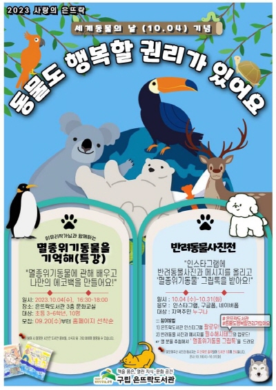 은평구가 다음달 4일 구립은뜨락도서관에서 세계동물의 날을 맞아 ‘동물도 행복할 권리가 있어요’ 행사를 개최한다. 이 행사는 특강 ‘멸종위기동물을 기억해’와 ‘반려동물 사진전’이 운영된다.
