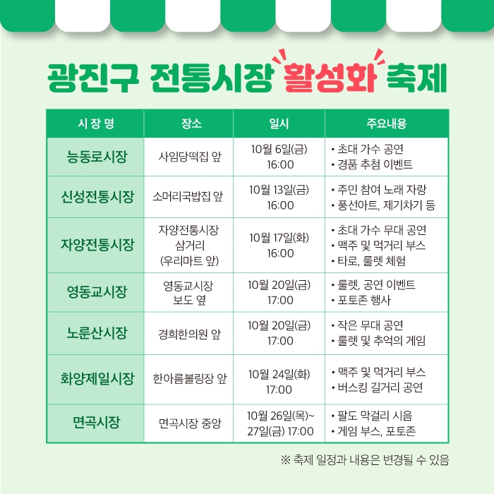 신성전통시장은 13일 노래자랑과 제기차기를, 자양전통시장은 17일 가수공연과 맥주부스를 선보인다.