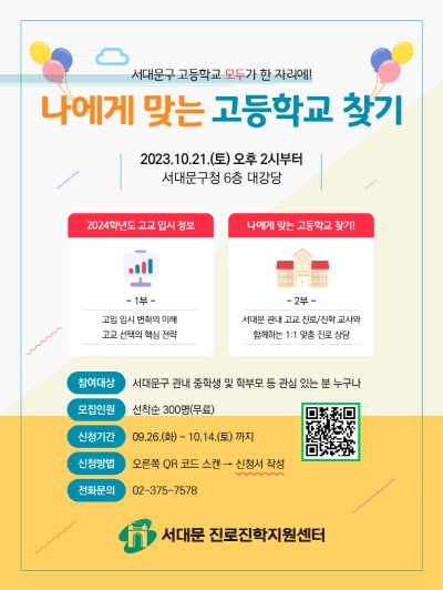 한편 올해 6월 개관한 ‘서대문 진로진학지원센터’(02-375-7578)는 진로, 학습, 입시를 위한 전문 교육 상담 기관으로 상시 컨설팅 창구를 운영하고 있으며 누리집 예약을 통해 이용할 수 있다.