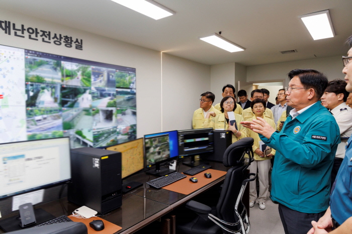재난안전상황실 관제실에서 재난위험시설을 모니터링 하고 있는 박강수 구청장. 마포구청 제공