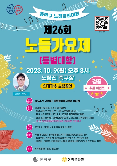 축제 기간 중인 9일 오후 3시에는 축구장 특설무대에서 제26회 노들가요제를 개최한다. 동작문화원이 주관한 이번 행사는 4년 만에 열려 구민뿐만 아니라 지역 소재 기업·학교의 직장인, 대학생·대학원생까지 신청 단계에서 관심을 모았다. 가요제에 앞서 예선은 참가 신청자를 대상으로 지난달 23일 동작문화복지센터에서 개최, 본선 진출자 17팀을 선정했다. 본선에서는 동작구 홍보대사 방송인 김병찬이 사회를 맡으며, 참가자 17팀의 경연과 초대가수의 축하무대가 펼쳐진다.