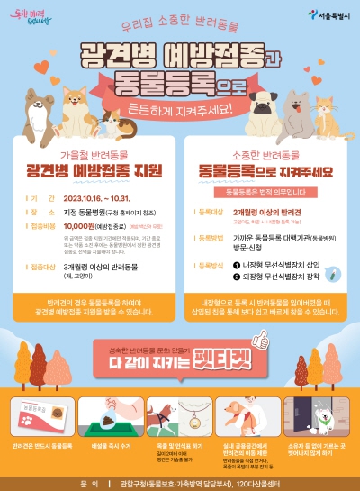 구 관계자는 “반려인과 반려동물의 안전을 위해 3개월령 이상의 개와 고양이는 반드시 1년에 1회 광견병 예방접종을 받아야 한다”며 “성숙한 반려동물 문화 정착을 위한 동물등록제 참여와 접종 대기 시 목줄 짧게 잡기 및 맹견의 입마개 착용을 부탁드린다”고 말했다.
