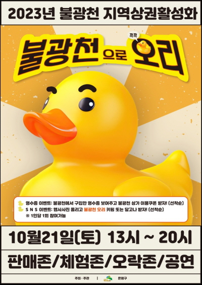 은평구가 21일 오후 1~8시 불광천에서 지역상권 활성화 행사 ‘불광천으로 오리’를 개최한다. 이번 행사는 초대 가수 공연, 영수증 이벤트(쿠폰 증정), 누리소통망(SNS) 이벤트, 각종 오락·체험부스 등 지역주민들이 즐길 수 있는 요소들이 많이 준비됐다.