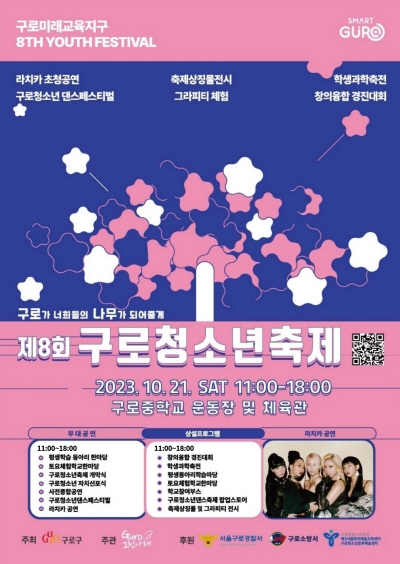 구로구가 ‘제8회 구로청소년축제’를 21일 오전 11시 구로중학교 운동장에서 개최한다. 이번 축제 주제는 ‘구로가 너희들의 나무가 되어줄게’다. 이날 축제에는 청소년과 학부모, 교사, 지역주민 등 2천여 명이 참여할 것으로 예상된다.