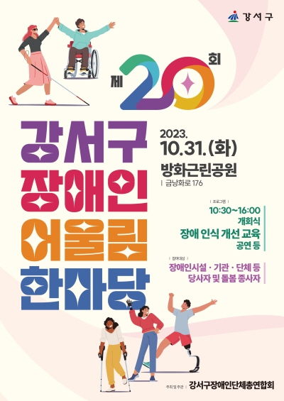강서구가 오는 31일 오전 10시30분~오후 4시 방화근린공원(금낭화로 176)에서 ‘제20회 장애인 어울림한마당’을 개최한다. 강서구장애인단체총연합회가 주관하는 이번 행사는 장애인 당사자 및 돌봄 종사자, 주민 등 1000여명이 참석한 가운데 전자현악 여성 3인조 그룹 ‘디오네’의 축하 공연과 함께 △1부 개회식 및 체험부스 활동 △2부 장애인식개선교육(문화예술 공연 및 토크콘서트)으로 꾸며진다.