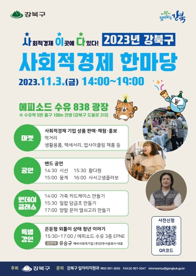 사회적경제 한마당에는 평소 사회적경제에 관심이 있는 구민은 누구나 참여할 수 있다. 자세한 내용은 강북구 홈페이지에서 확인하면 된다.