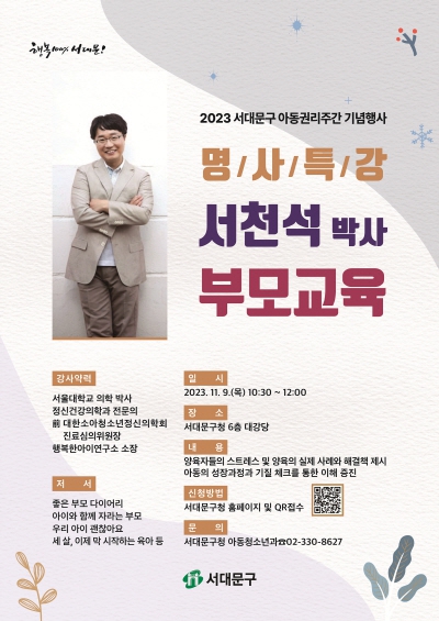 서대문구가 아동권리주간을 기념해 다음달 9일 오전 10시30분부터 정오까지 구청 6층 대강당에서 서천석 박사 초청 ‘부모 교육 특강’을 개최한다. 정신건강의학과 전문의이자 행복한아이연구소 소장인 서천석 박사는 ‘아이와 함께 자라는 부모’ ‘하루에 10분 내 아이를 생각하다’ 등 다수의 저서를 집필했으며 ‘어쩌다 어른’ ‘여성시대’ ‘나의 첫 사회생활’ ‘걱정말아요 그대’ 등의 방송에도 출연했다.
