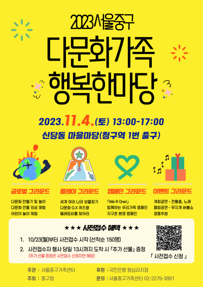 서울 중구의 다문화가족이 한자리에 모여 서로의 문화를 이해하고 소통하는 장이 펼쳐진다. 서울중구가족센터는 다음달 4일 신당동 마을마당(청구역 1번 출구 앞)에서 오후 1시부터 5시까지 다문화가족 300여명과 함께 ‘다문화가족 행복한마당(이하 다문화 한마당)’을 개최한다. 국민은행 왕십리지점이 이번 행사에 후원의 손길을 전했다.
